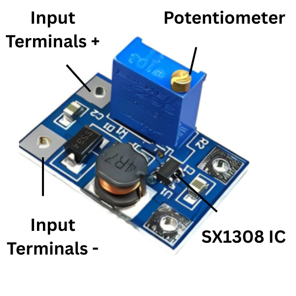 This compact and efficient DC-DC step-up converter module, powered by the SX1308 IC, is designed to boost a lower input voltage to a higher, adjustable output voltage. It's ideal for powering various electronic devices that require higher voltage than the available input source.
