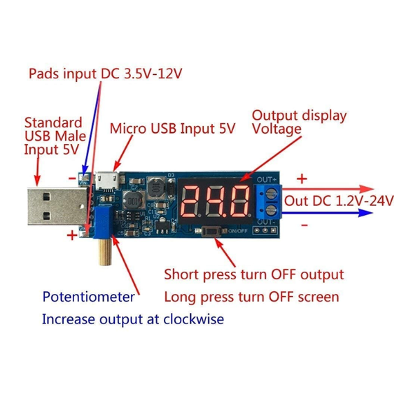 Adjustable Output Voltage: Utilizing a multi-turn precise adjustable potentiometer, users can set the desired output voltage between 1.2V and 24V.