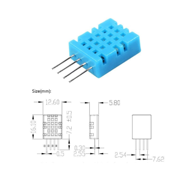 The DHT11 is a low-cost temperature and humidity sensor module that provides real-time measurements. It uses a capacitive sensing element to measure relative humidity and a thermistor to measure temperature. The sensor outputs a digital signal that can be easily read by a microcontroller or other digital devices.