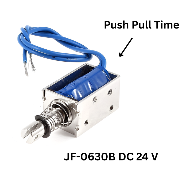 The JF-0630B is a compact and powerful DC solenoid electromagnet designed for various applications requiring linear motion. It operates on a 24V DC supply and draws a current of 300mA, generating a pushing force of 6N. The solenoid has a stroke length of 10mm and features a push-pull configuration, allowing it to move in both directions.