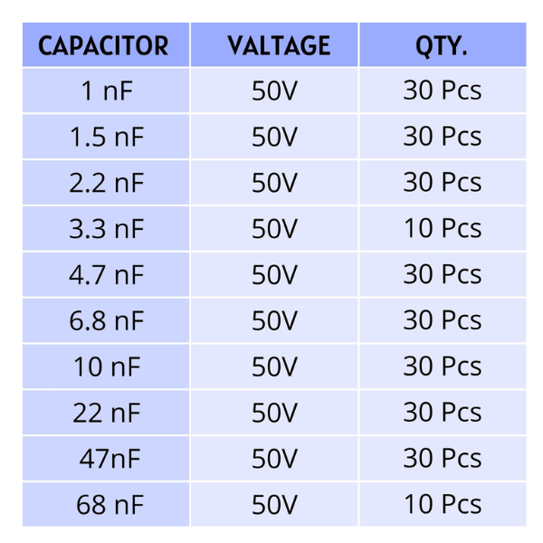 - Capacitance Values: 1nF, 2nF, 3nF, and 4.7nF