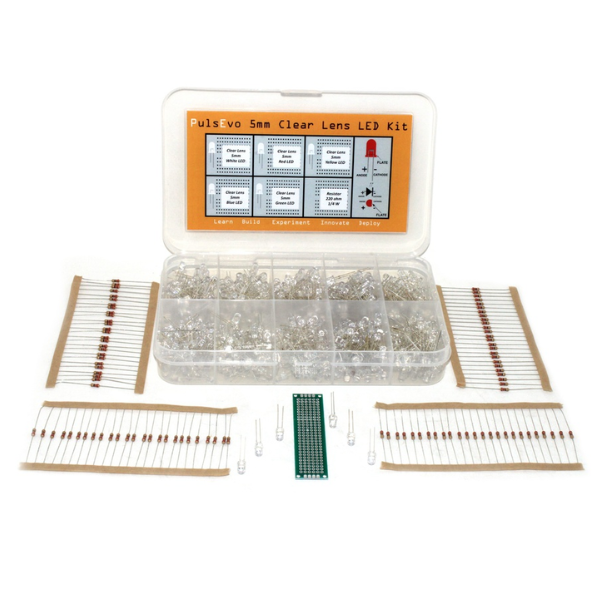 The PulsEvo 5mm Clear Lens LED Assortment Kit With Bonus Resistor Pack - 500 pcs is a comprehensive collection of 500 high-quality 5mm LEDs with clear lenses, along with a bonus pack of resistors. This kit offers a wide variety of colors and is ideal for various electronic projects and applications.
