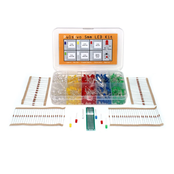 The PulsEvo 5mm Diffused LED (500 Pcs) Assortment Kit With Bonus PCB An is a comprehensive collection of 500 high-quality 5mm diffused LEDs, along with a bonus pack of PCBs (Printed Circuit Boards). This kit offers a versatile range of colors and is ideal for various electronic projects and applications.