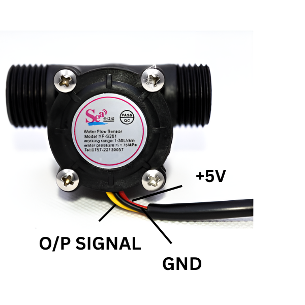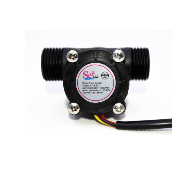 The YF-S201 is a compact and versatile water flow sensor designed to measure the flow rate of liquids. This particular model features a 1/2 inch connection and a black housing. It operates by utilizing a turbine-type rotor that spins as water flows through it. A Hall Effect sensor detects the rotation of the rotor, generating electrical pulses that are proportional to the flow rate.