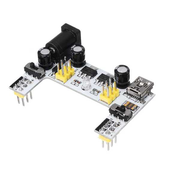 This is a power supply module for the standard breadboard. Its concave design will not waste your proto zone. This breadboard power shield supports a Mini USB power supply and power jack 7-12V supply. There are two independent power optional: 5V/3.3V. With this board, you can send power to both power lanes of the breadboard, and each side has an on/off switch.