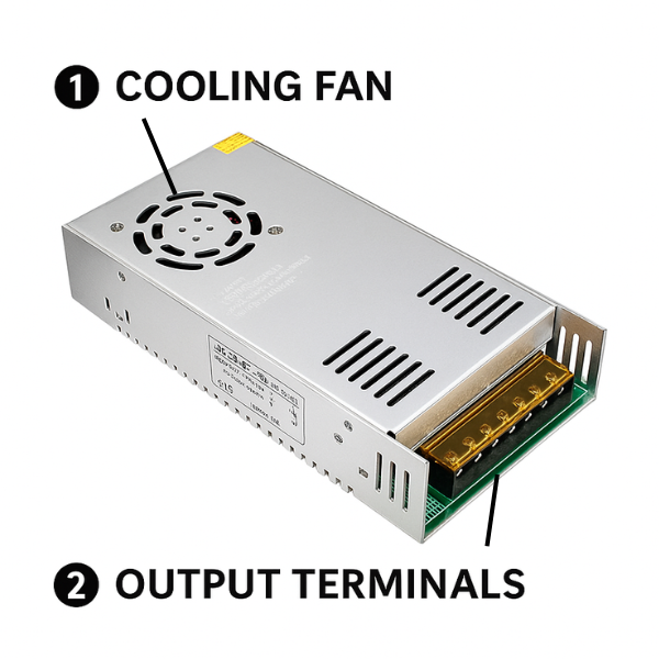 An industrial SMPS (Switched-Mode Power Supply) is a highly efficient electronic device that converts AC power to DC power. This particular model is rated for 12V output voltage and 30A output current, making it suitable for powering various industrial applications.