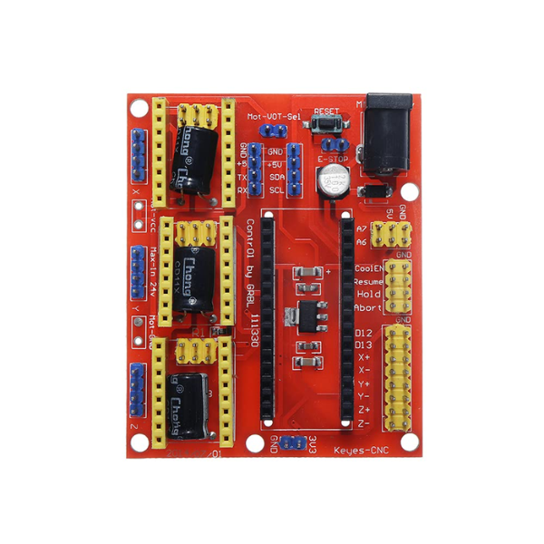 CNC shield V4 needs to work with the nano board. It can be used as a driver’s expansion board for engraving machines and 3D printers. It has in total 3 channel slots for stepper motor driver modules (not included) for driving 3 channels of stepper motors. Each channel of stepper motor only needs 2 IO ports, which means 6 IO ports are sufficient to manage 3 stepper motors. This shield can make quick work for managing stepper motors in your project.