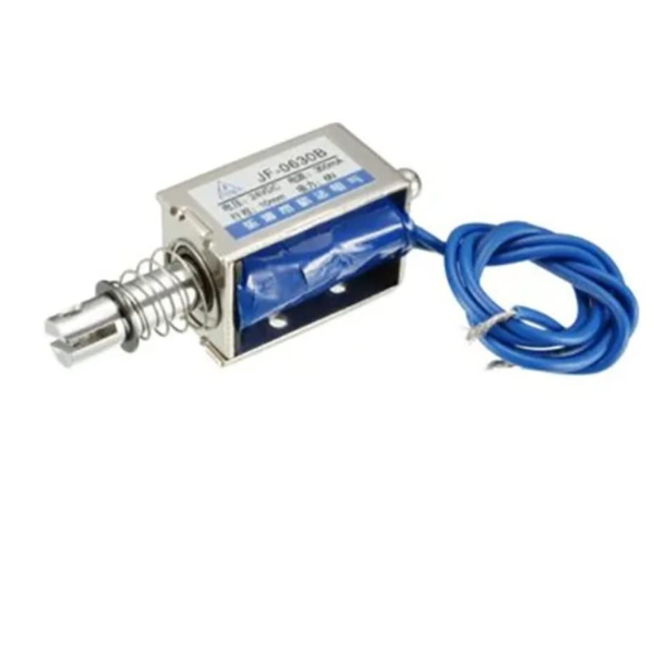 The JF-0630B is a compact and powerful DC solenoid electromagnet designed for various applications requiring linear motion. It operates on a 24V DC supply and draws a current of 300mA, generating a pushing force of 6N. The solenoid has a stroke length of 10mm and features a push-pull configuration, allowing it to move in both directions.