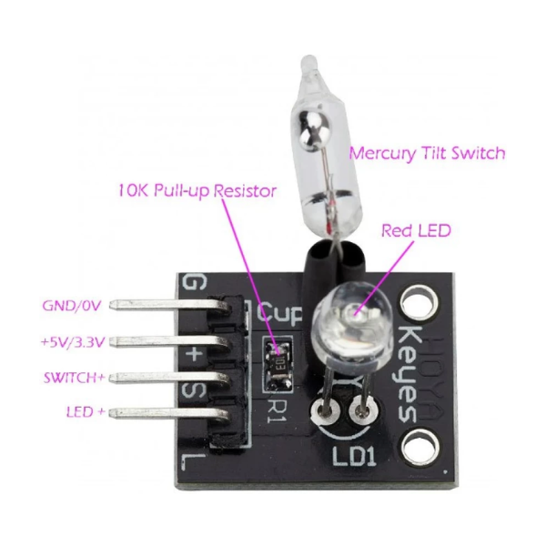 - Mercury Tilt Switch: Detects changes in orientation, triggering the LED.