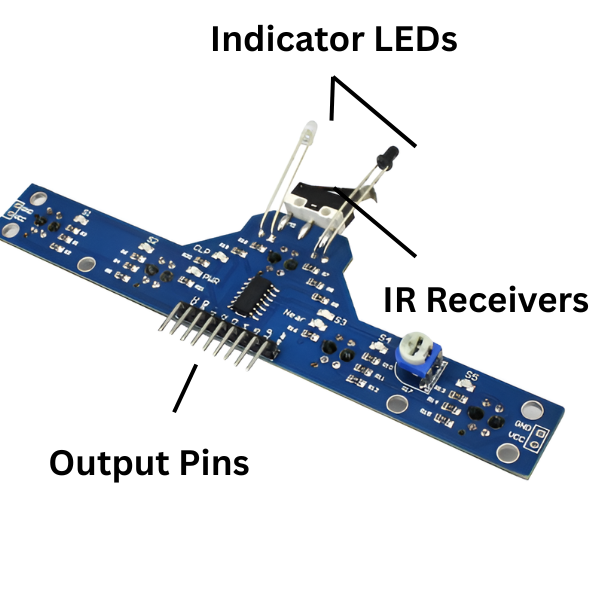 An Obstacle 5 IR Sensor Array is a device designed to detect the presence of objects using infrared light. It typically consists of five infrared emitters and five infrared detectors arranged in a specific pattern. When the infrared light emitted by the sensors reflects off an object, the detectors can detect the reflected signal, indicating the presence of the obstacle.