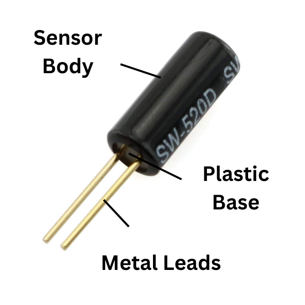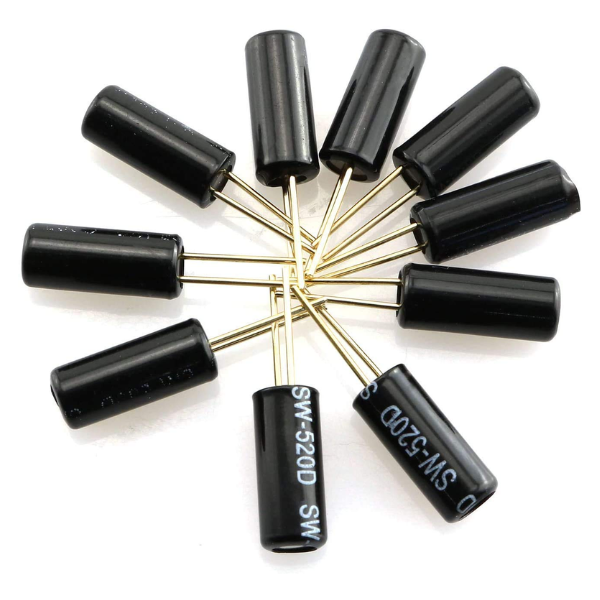 The SW-520D Vibration Sensor Metal Ball Tilt Switch has a shrink tubing cover to prevent short circuits. It has two conductive elements (poles) at one end of the sensor. The sensor acts as a throw switch when the mass rolls onto the poles and shorts them, if the sensor is positioned with the leads downwards. Roller ball tilt switches are simpler than full accelerometers because they can detect motion or orientation without extra circuitry. Full accelerometers, however, need to analyze the digital or analog voltage they output.