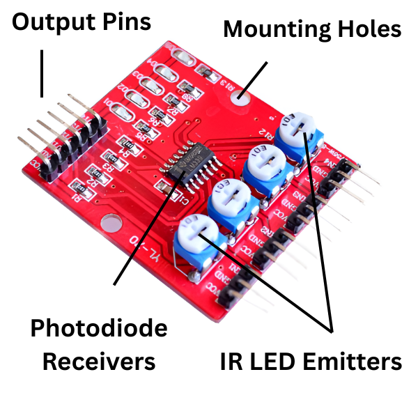 An IR 4 Way Line Sensor Array is a device designed to detect the presence of a reflective surface, such as a line, using infrared light. It typically consists of four infrared emitters and four infrared detectors arranged in a specific pattern. When the infrared light emitted by the sensors reflects off a line, the detectors can detect the reflected signal, indicating the presence of the line.