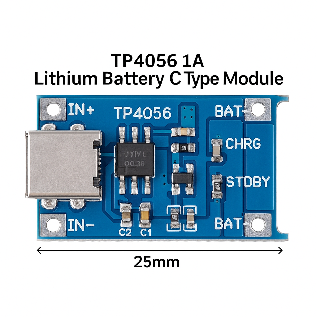 The TP4056 1A Lithium Battery Charger C Type Module is a compact and efficient power management solution designed to charge lithium-ion or lithium-polymer batteries. It features a USB Type-C input connector and provides a charging current of 1 Ampere.