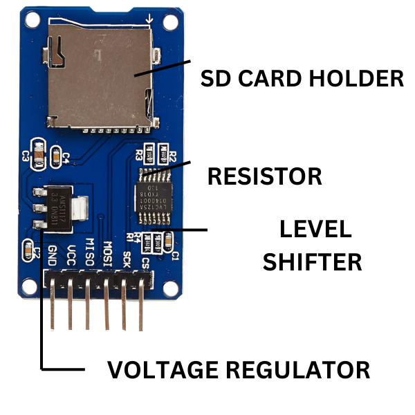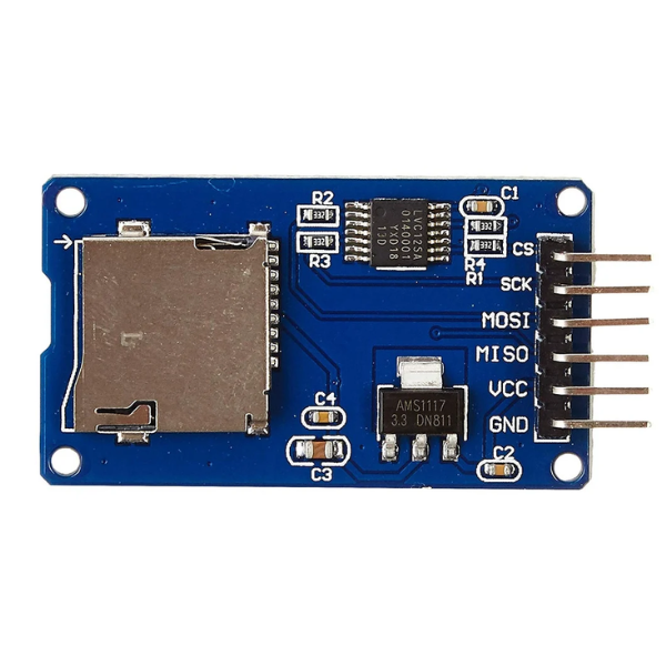 - Voltage Regulator: Steps down input voltage to 3.3V suitable for the MicroSD card.