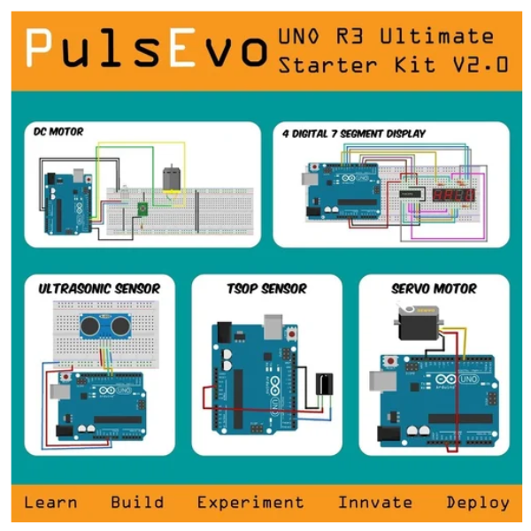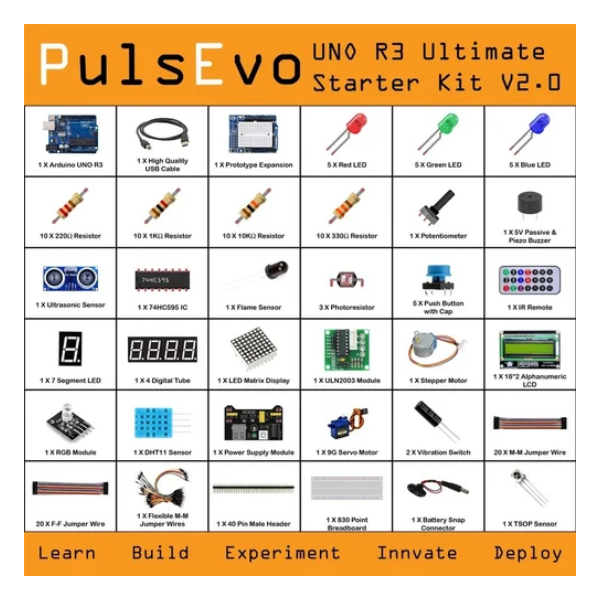 The PulsEvo UNO R3 Ultimate Starter Kit V2 is a comprehensive kit designed to introduce you to the world of Arduino and electronics. It includes everything you need to get started with your learning journey, including an Arduino UNO R3 board, various components, and detailed tutorials.