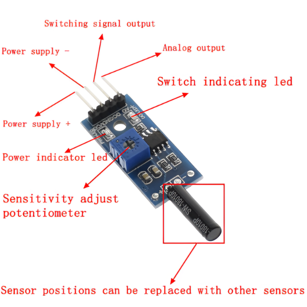 The Tilt Vibration SW-180 Sensor Switch Module is a compact and versatile device designed to detect both tilt and vibration. It incorporates a highly sensitive sensor that triggers an output signal when the module is tilted beyond a certain angle or subjected to vibrations. This makes it suitable for a wide range of applications, including: