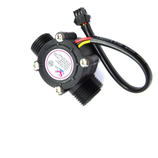 The YF-S201 is a compact and versatile water flow sensor designed to measure the flow rate of liquids. This particular model features a 1/2 inch connection and a black housing. It operates by utilizing a turbine-type rotor that spins as water flows through it. A Hall Effect sensor detects the rotation of the rotor, generating electrical pulses that are proportional to the flow rate.